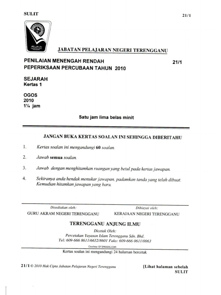 Peperiksaan Percubaan Bersama 1249 1 Sijil Pelajaran Malaysia 2010 Sejarah Kertas 1 Ogos